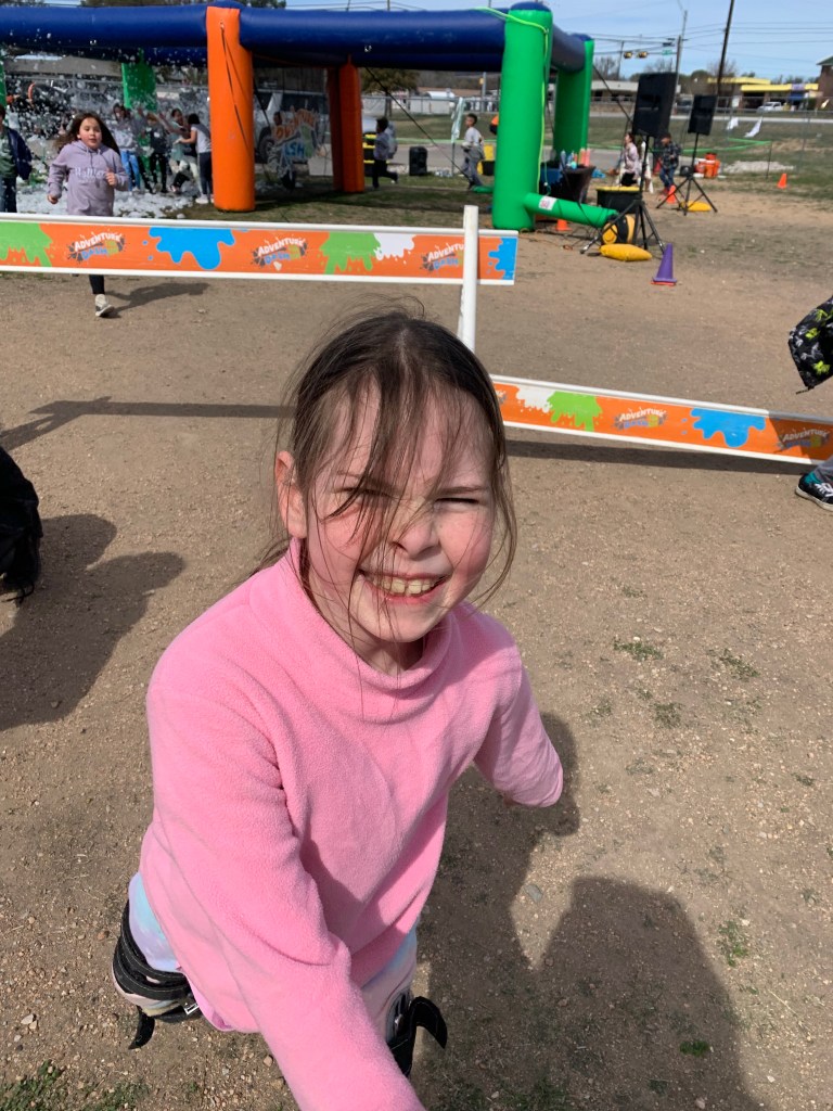 Helena couldn’t do several of the activities on the course. She couldn’t climb the inflatable mountain. She couldn’t jump the hurdles. She fell a lot. She was passed up constantly. She was left behind. This was more apparent this year than at the last fun run. Yet she was just so happy to be out there. She was giving it her all.
